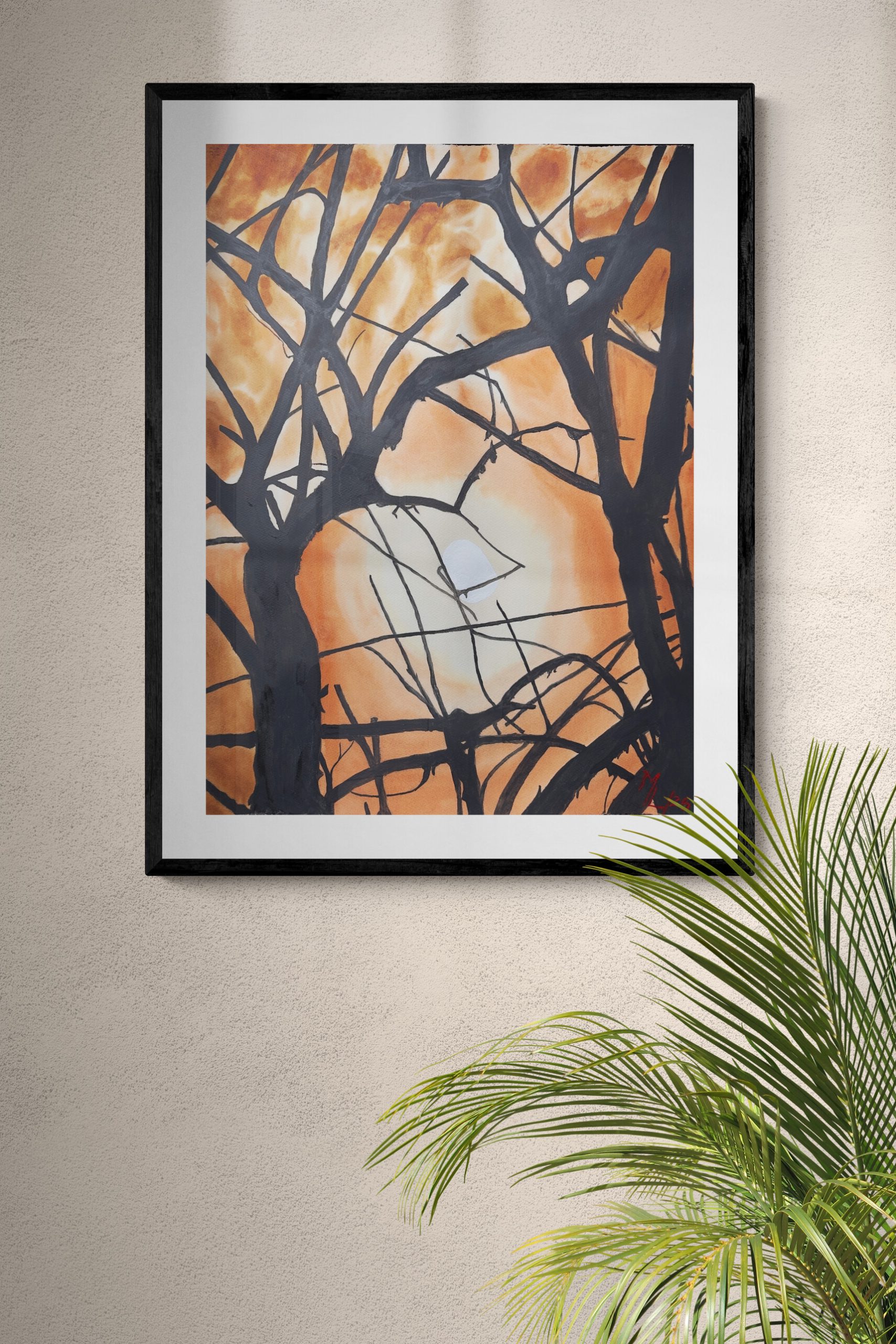 This time the Hunter's Moon came up through smoke or haze, turning the entire sky a deep amber. The trees stood as pure silhouettes – no detail, just solid black shapes against that saturated orange glow. I found an angle where the branches created this maze of lines, each one cutting across the warm sky in a different direction. With watercolour, I could build up the intensity of that orange, darker at the top, nearly white around the moon itself. Spring in Sydney can bring dust in the air, or sometimes smoke from distant fires, and it creates this theatrical lighting. The graphic quality appealed to me – almost like a woodcut, where everything reduces to shape and contrast.