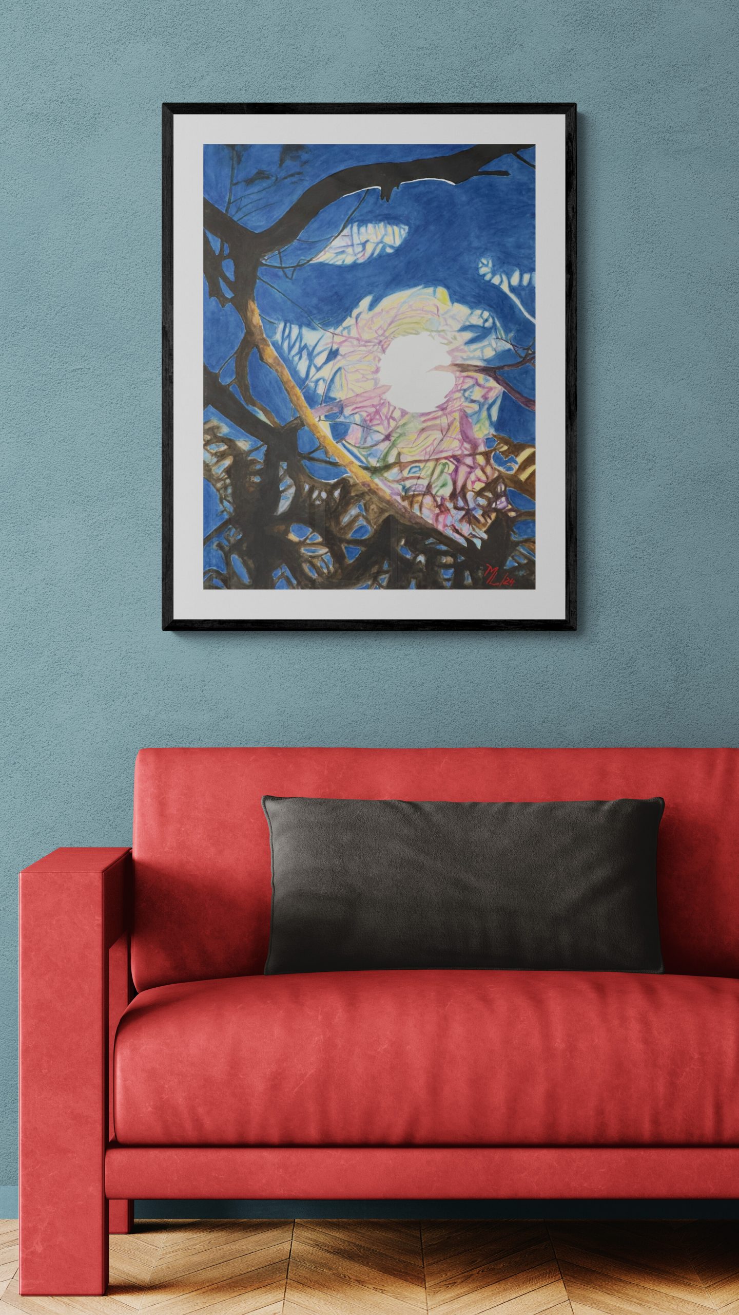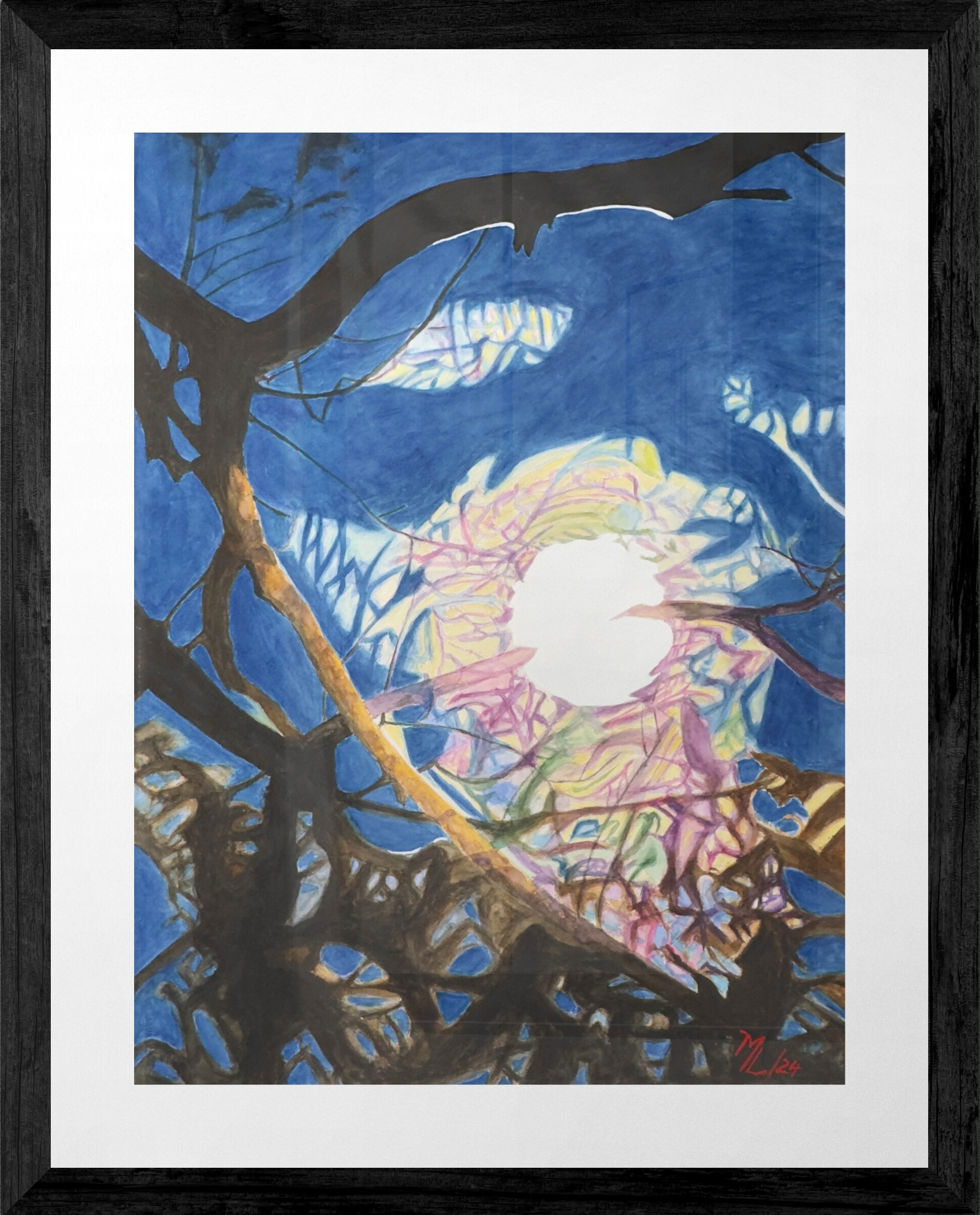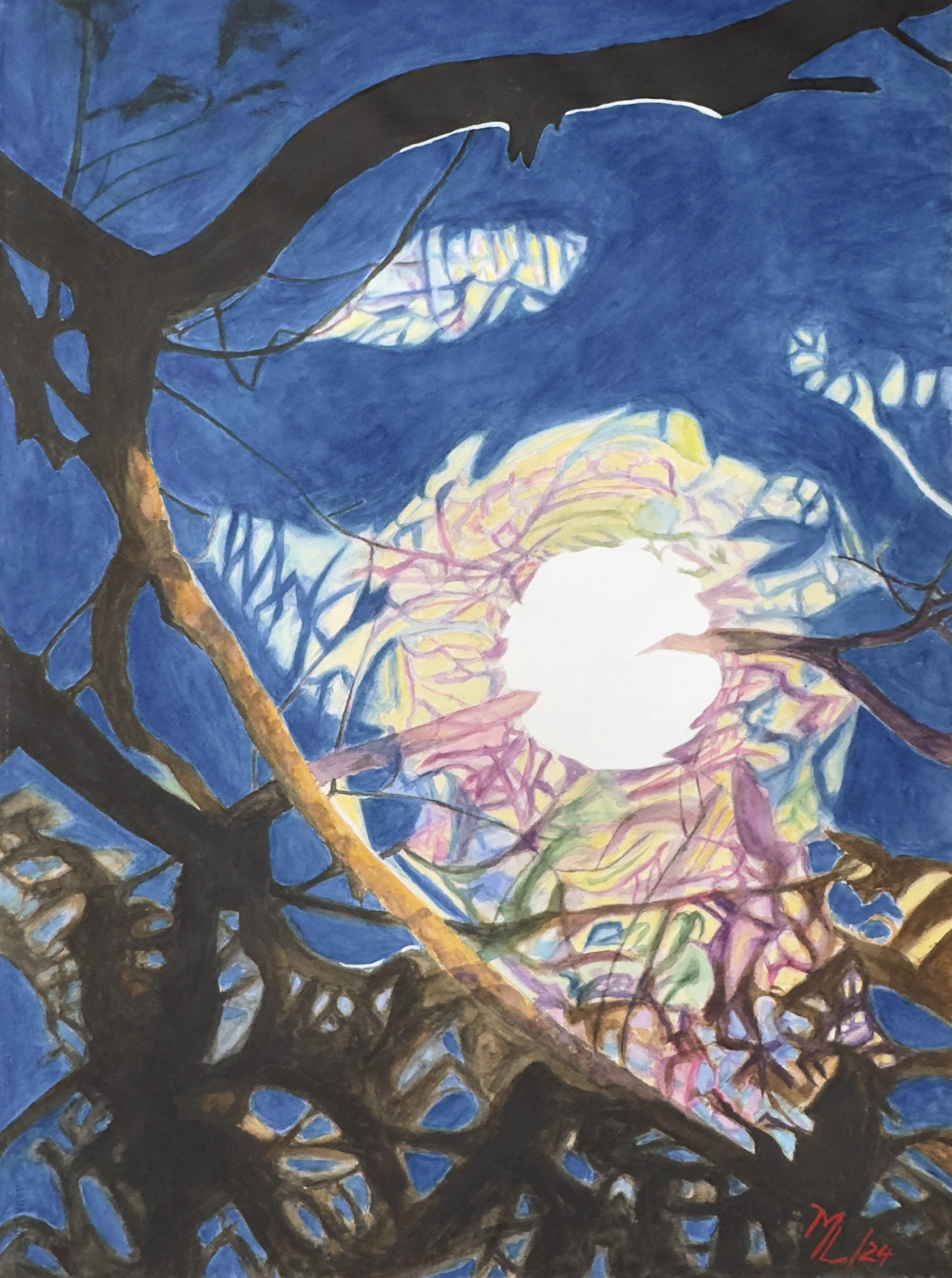 A blue moon doesn't actually look blue, but this night the sky was so intensely saturated it felt like the name finally made sense. I caught the moon with thick cloud cover creating this swirling halo effect – yellows, pinks, and greens mixing in the moisture around it, like light refracting through a prism. The branches cut across in bold silhouettes, some catching warm reflected light on their undersides. Watercolour let me play with those unexpected colours in the clouds without making them look artificial. The deep cobalt sky pushed everything forward. Sometimes the atmosphere does wild things with light that seem impossible until you're actually standing there watching it happen.